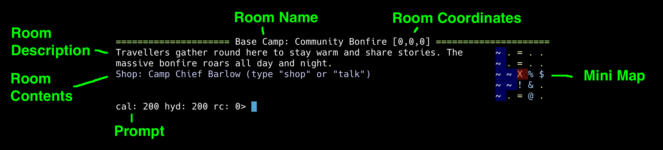 - Prompt -- This is always shown after every command so you can keep track of your character status. It shows your calories, hydration, and return cost.