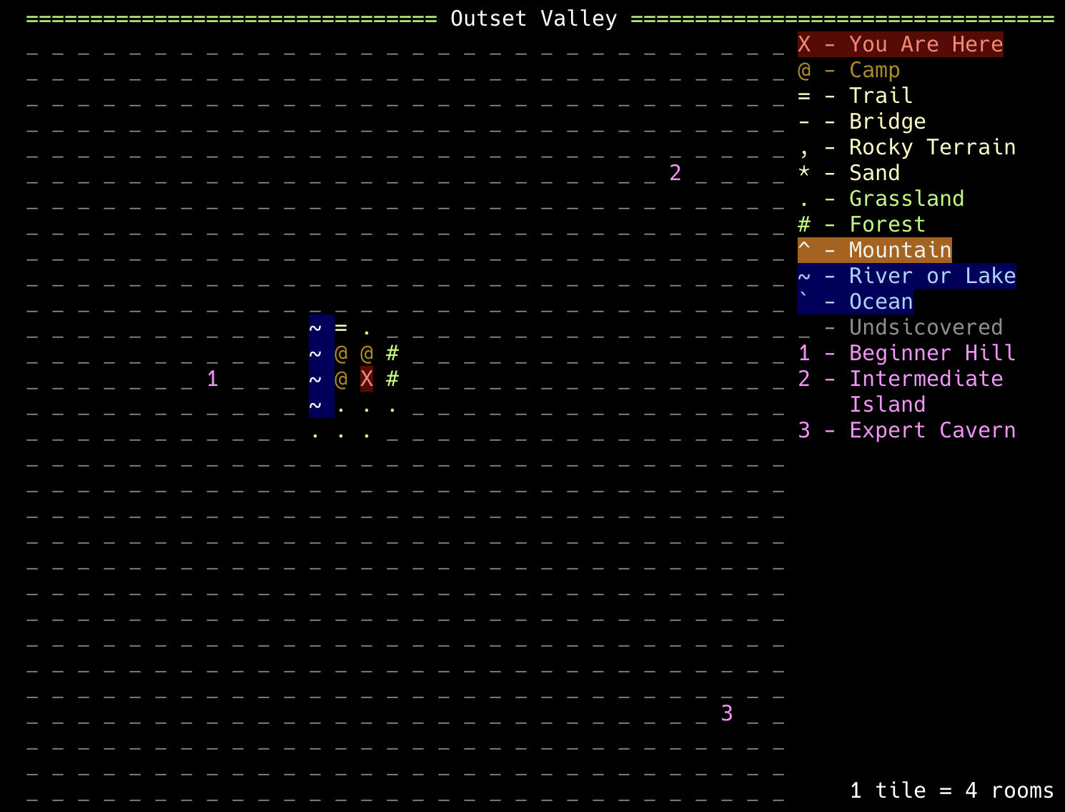 At camp, you can buy supplies, refill your water bottle, and rest before you head out on your next adventure. Buying food can be smart, but watch your load using the "inventory" command. Carrying too much makes movement cost more. Sometimes it's better to find food along the way, especially if you have found good fishing spots or places to forage. Just keep in mind you have to camp to cook, and camping requires a fire starter (such as kindling). You can forage for kindling in any forest. If you're resourceful, you can make the most of the tools at your disposal to extend your excursions.